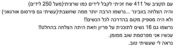או למשל רחלי רביב גרינברג, שעפה על שיחות המכירה הקלות שמגיעות בזכות ההרצאה: